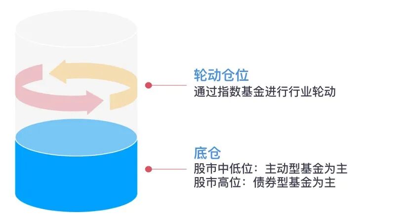 底仓部分,在股市中低估值区域,底仓以主动管理权益基金为主,获取股市长期上涨和基金经理主动管理的双重收益;在股市高估值区域,底仓以固收类基金为主,争取降低投资风险。