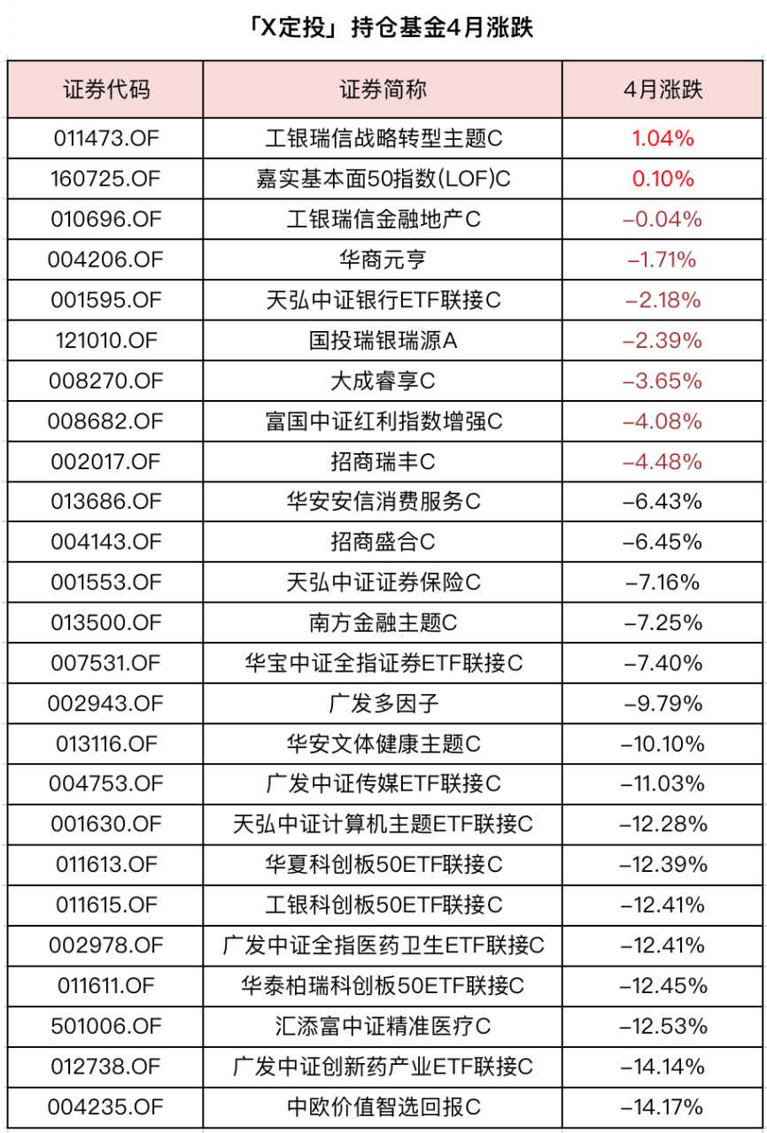 4月,X定投持仓基金中,有2只取得正收益,9只跑赢沪深300指数。