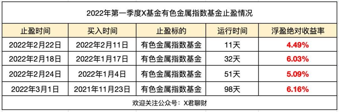 X基金今年第一季度曾成功操作过一波有色指数,低位买入,高位及时止盈。