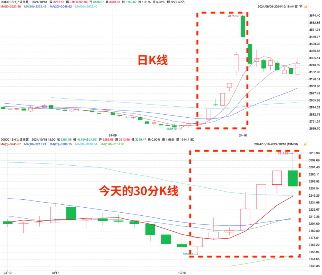 其实今天有点像国庆节前的缩小版。潘行长上午的讲话对应9月24日的联合发布会,主席中午的讲话对应9月26日的“干字当头”,真的挺严丝合缝的。还有人说“今天的30分钟K线就和最近的日K线差不多”,很有意思。