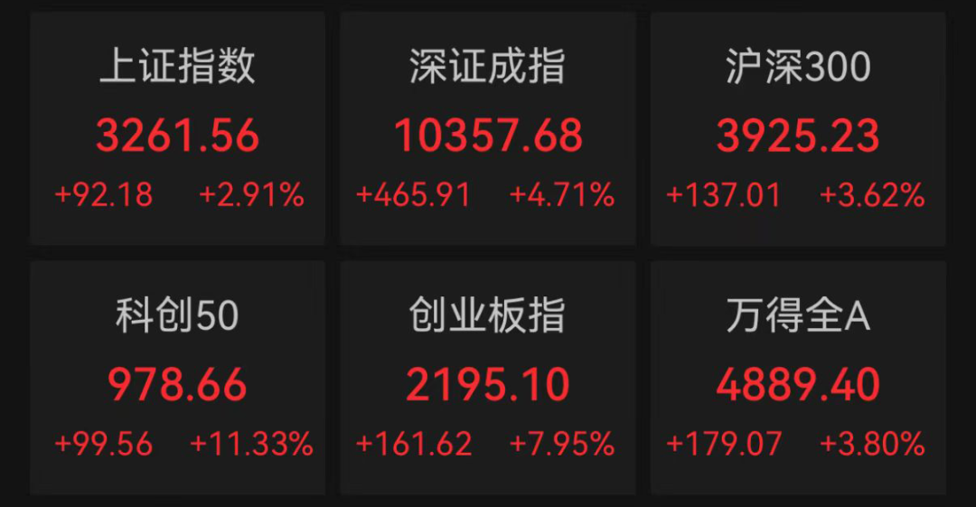 上证指数涨+2.91%,创业板指涨+7.95%,科创50指数涨+11.33%,个股中位数+2.74%,成交量再次突破2万亿。