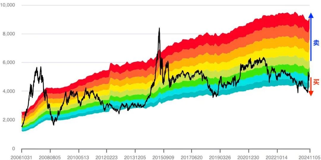 还是推荐我们的彩虹图,比较简单清晰:在0/1/2档更适合买入,5-6档及以上可以分批卖出。
