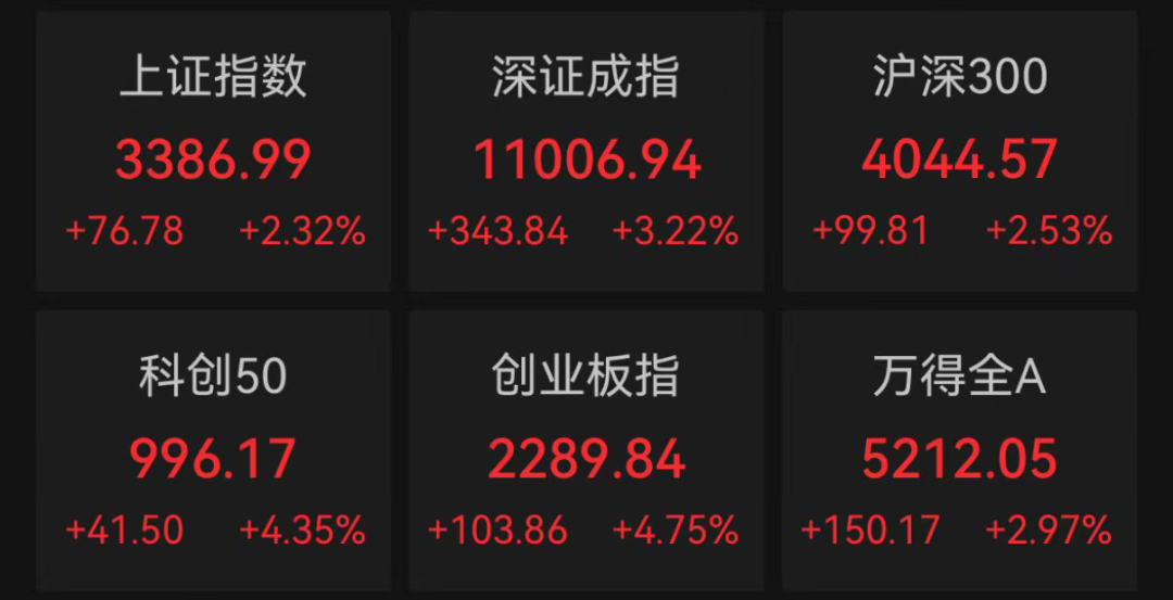 不过咱们A股这边已经沸腾了,今天全线上涨,上证指数收涨+2.32%,创业板指更是大涨+4.75%,个股中位数+2.48%。成交额2.35万亿,是10月初回调以来的新高,情绪非常高昂。