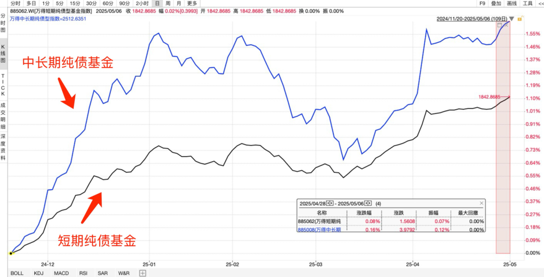 数据来源:万得截图,短期纯债基金指数、中长期纯债基金指数,2024.12到2025.5的走势图