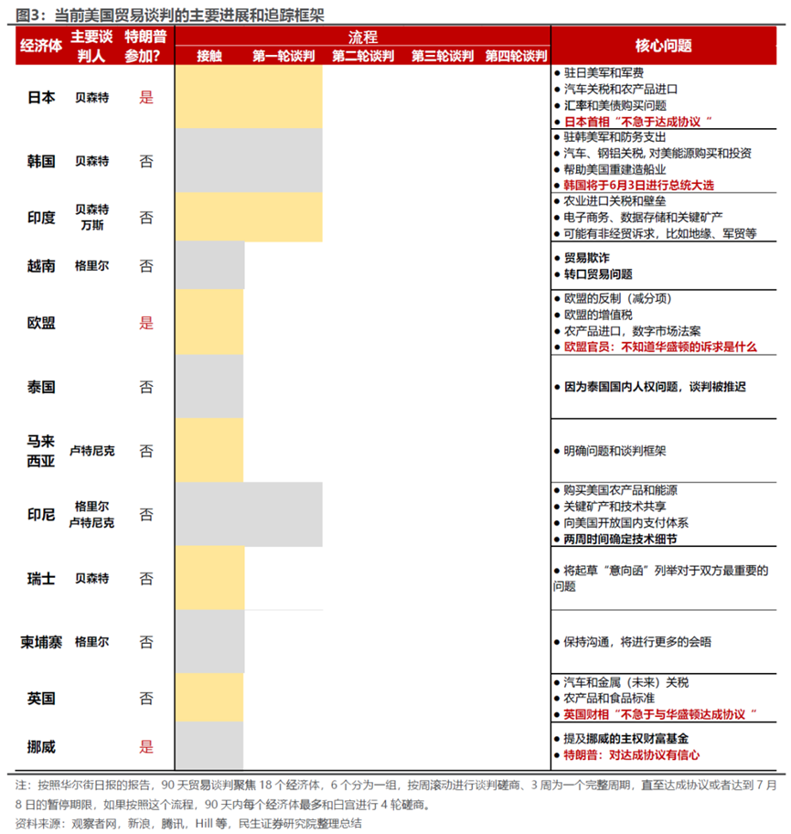 实际上,现在我方仍然表示不让步的状态,反而是美国那边时不时放出烟雾弹说中美正在谈判,有种谁硬谁软一目了然的感觉。而美国与其他国家的谈判看起来进展并不明显(下图)。