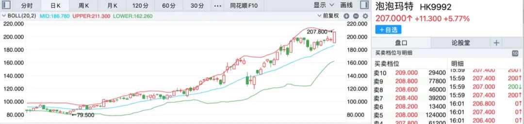 在22年时,泡泡玛特股价最低跌到了9元,但现在已经飙升到了207元,三年时间翻了20+倍。