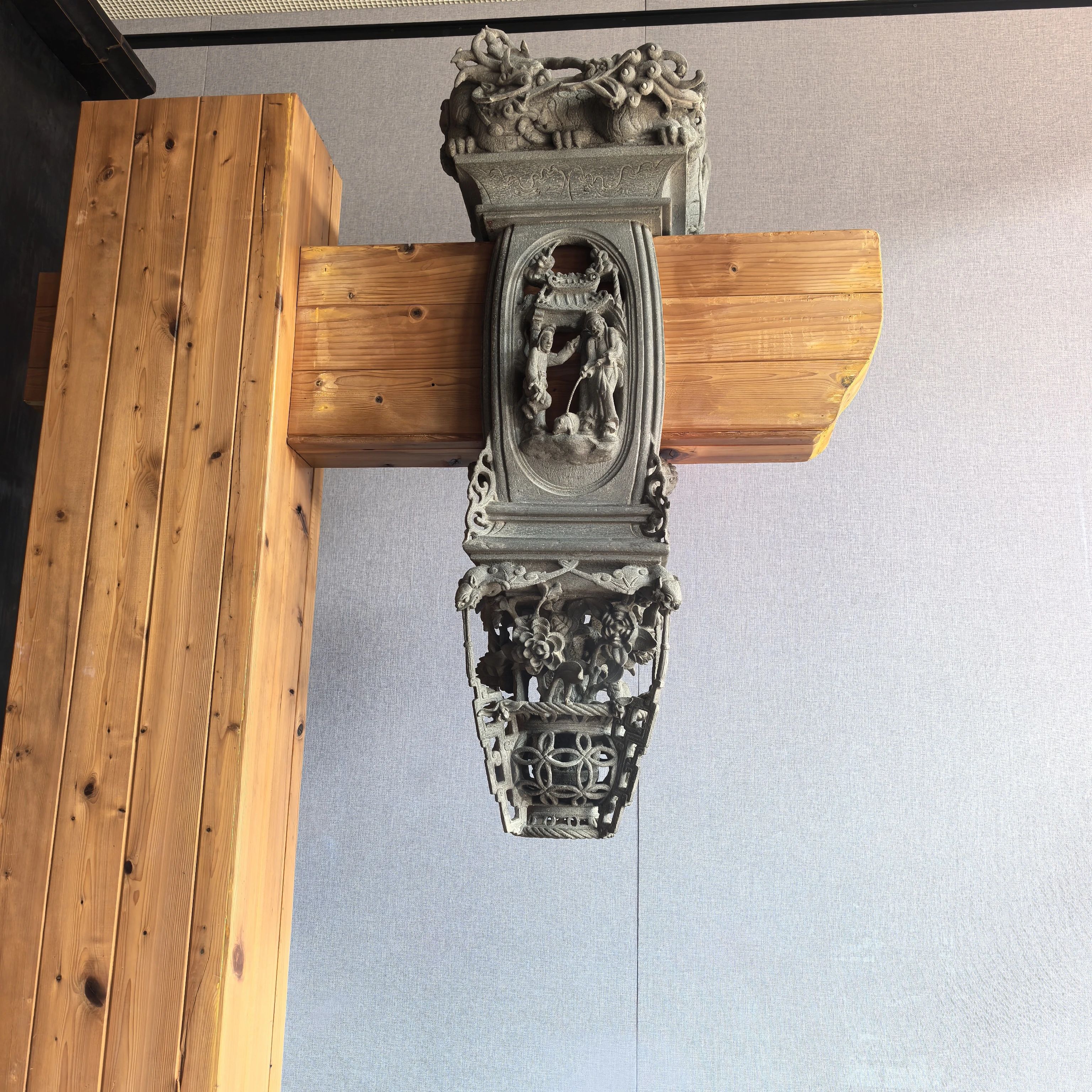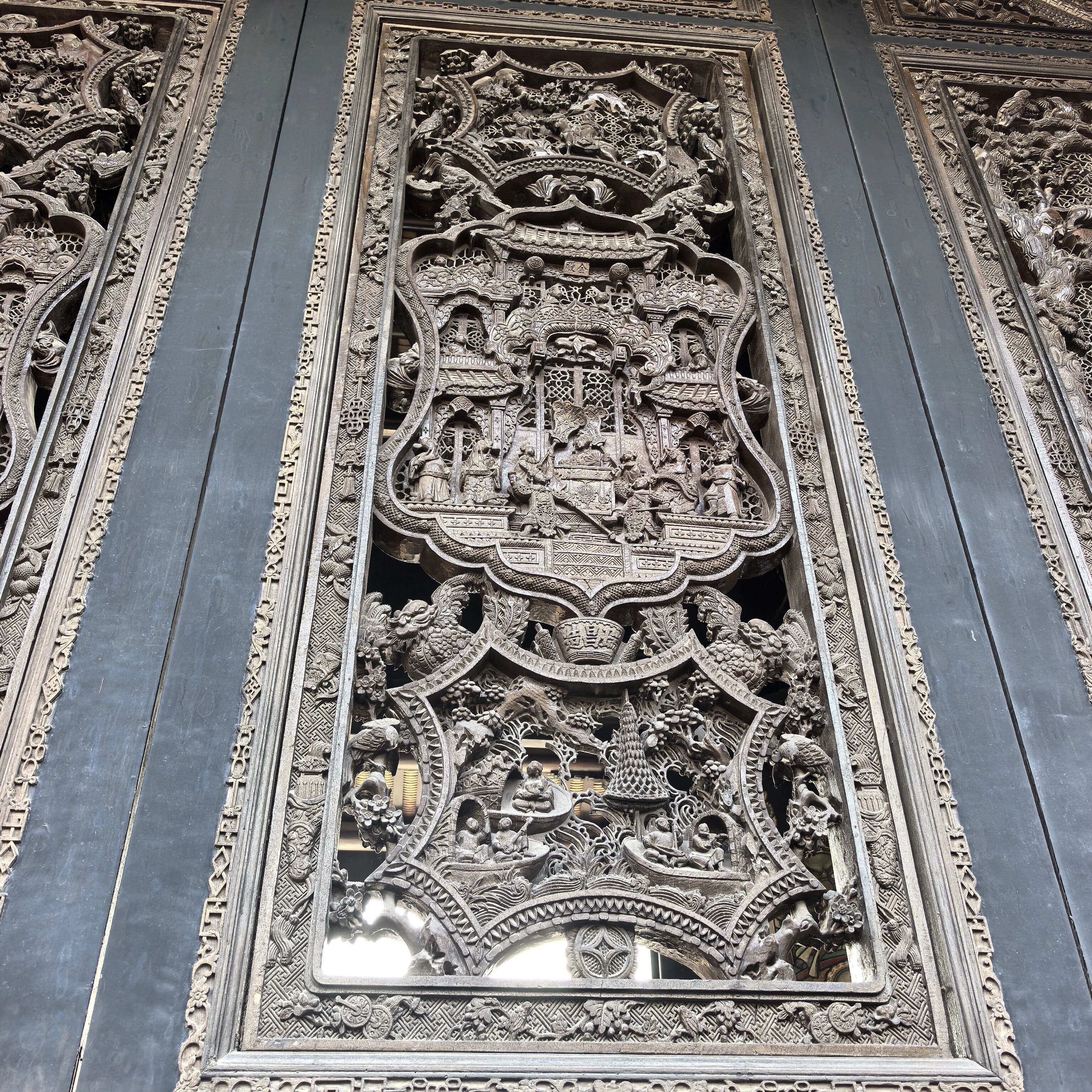 下图是石雕,但这个不是陈家祠的,陈家祠里的石雕比不上这个精美。这是征集来陈列在陈家祠的,中间部分是曾参杀猪的故事,曾参手里牵着小猪,那跟绳,也是石头的,整块石头雕刻出来的这么个作品,仅仅是个垂花门斗。有钱就是不一样啊~