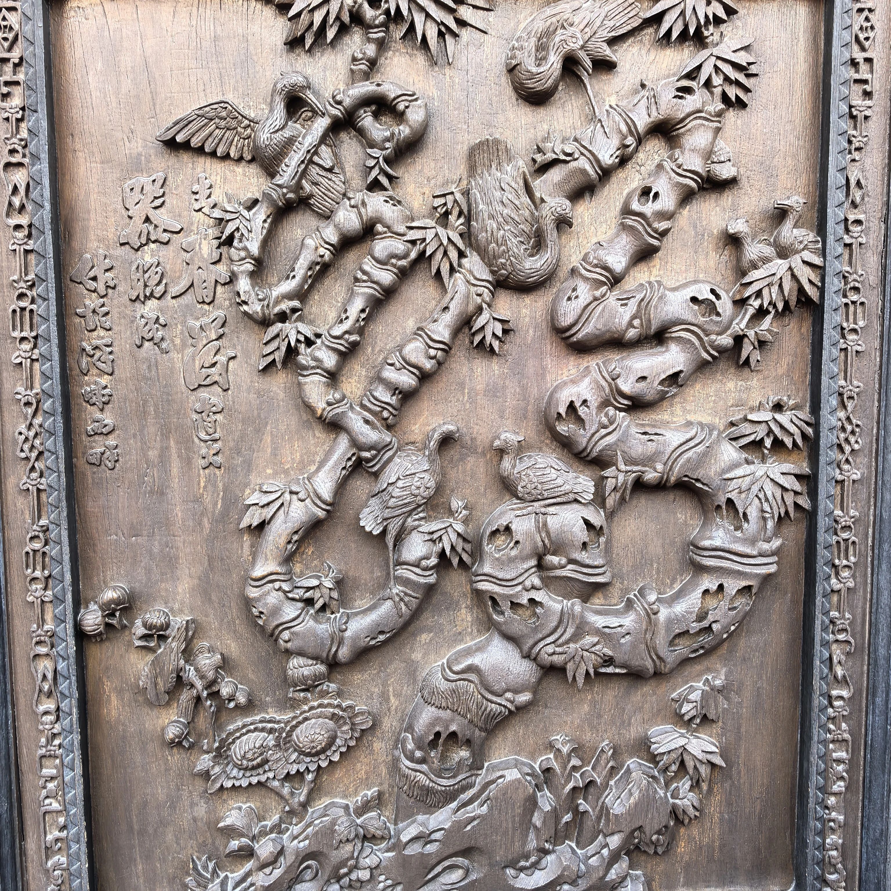 下面两张图都是木雕,很有代表性的图案。第一张是个“福”字,雕刻成老竹出新芽,意思是不要放弃读书,即便青春时候没有出人头地,你也可以大器晚成。同时“福”字还能拆开了看,左边像“多”右边像“寿”,也意味着多福多寿。