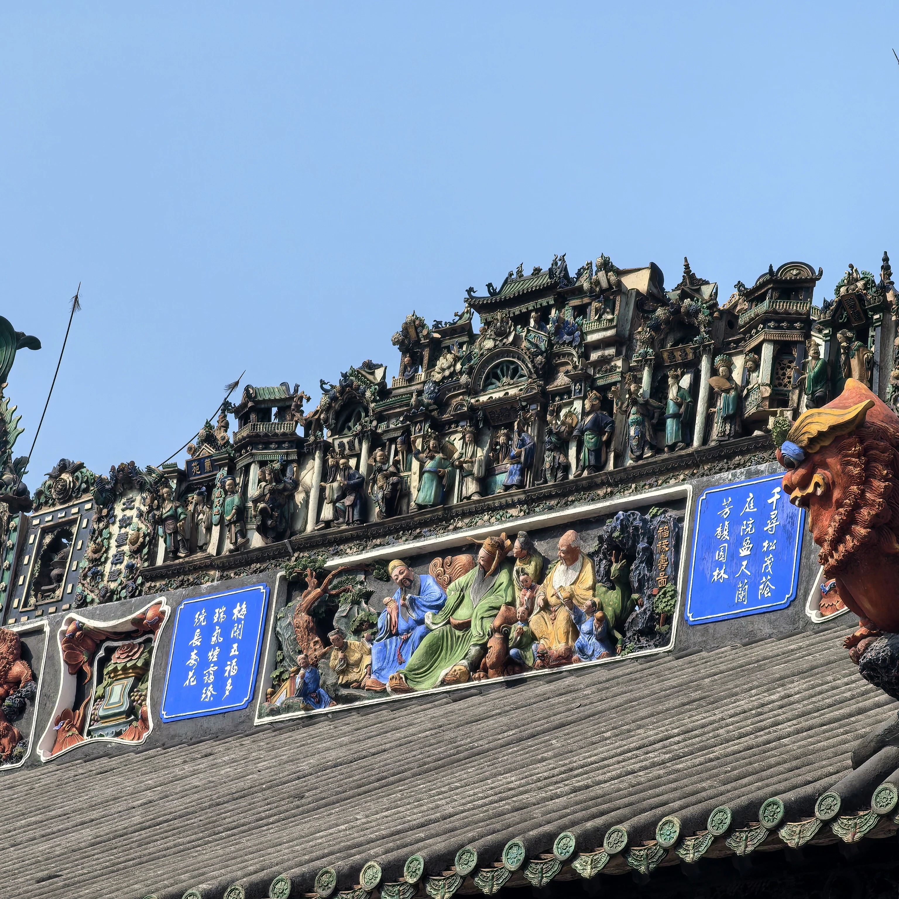 下图屋顶就有陶塑和灰塑。陶塑的是最高层骑楼样式。灰塑的是下一层的各种吉祥故事,灰塑类似于泥塑,材料有所不同。灰塑还需要定期上色,平均六七年就要上色一次。