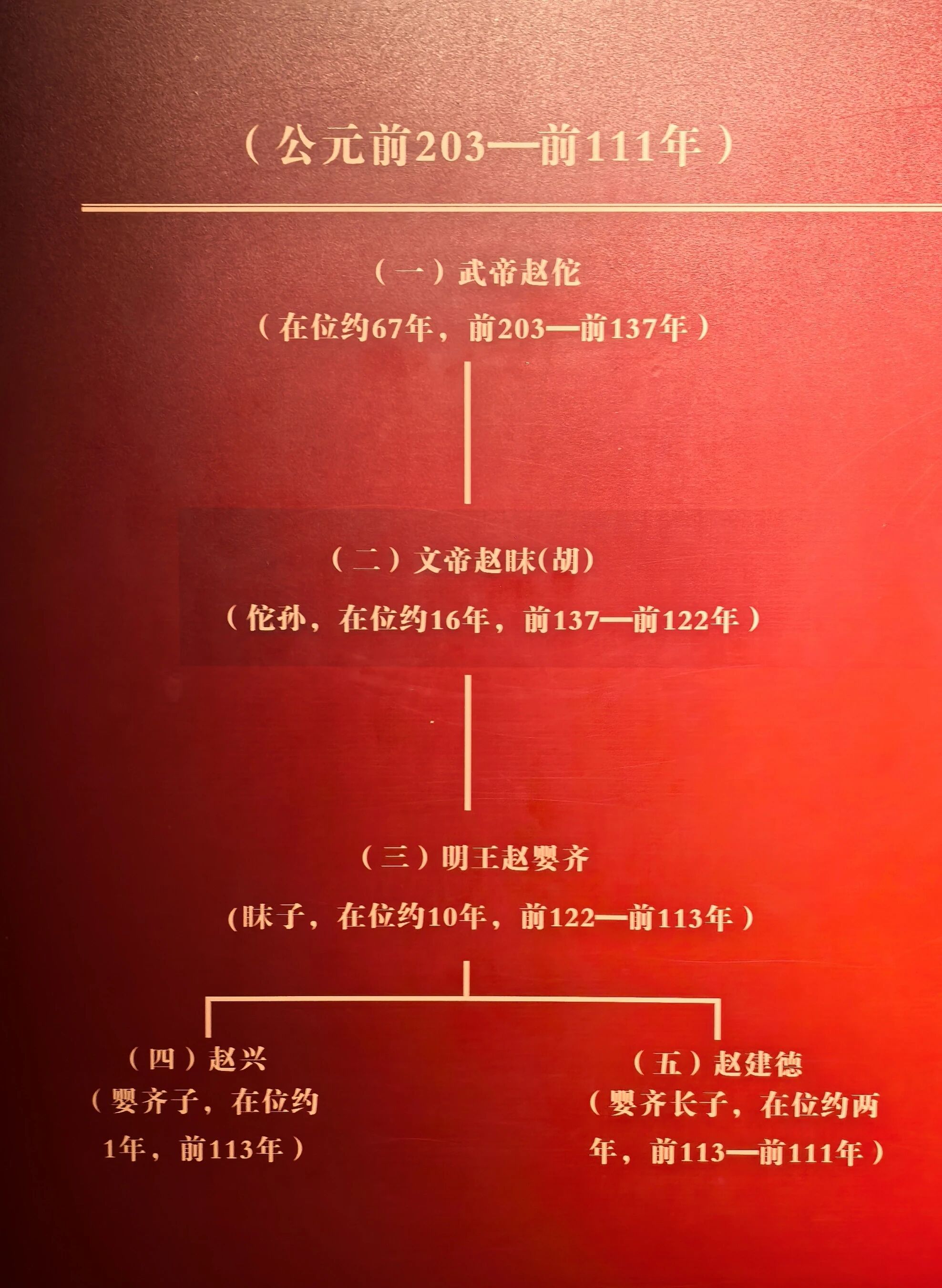 有一个妈妈带小孩,给孩子讲下面的图,说南越武帝活了70多岁。可是人家在位就67年了,难不成幼儿登基的?事实上,赵佗活了100多岁,经历过4个皇帝,把自己儿子都熬没了,只能传位给孙子。