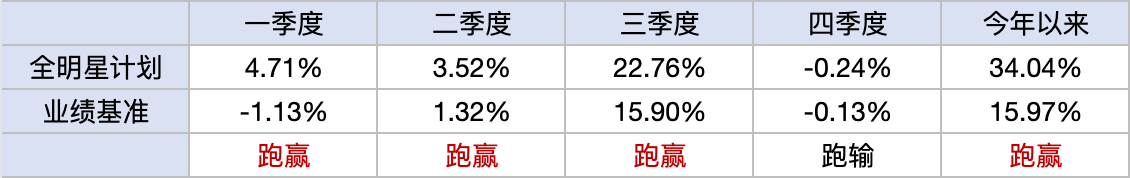 2025年,全明星计划阶段上涨34.04%,同期业绩基准上涨15.97%,全明星计划跑赢业绩基准18.07%。