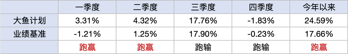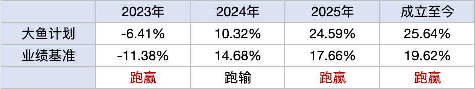 2025年,大鱼计划上涨24.59%,同期业绩基准上涨17.66%,大鱼计划跑赢业绩基准6.93%。