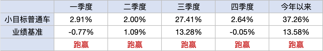 2025年,小目标普通车平均上涨37.26%,业绩基准上涨13.58%,跑赢基准23.68%。