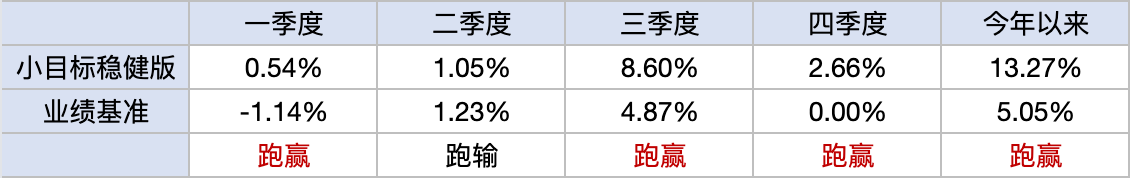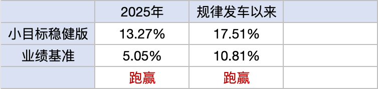 2025年,小目标稳健版平均上涨13.27%,业绩基准上涨5.05%,跑赢基准8.22%。