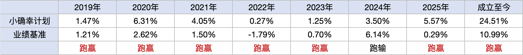 2025年,小确幸计划上涨5.57%,同期业绩基准上涨0.29%,跑赢业绩基准5.28%。