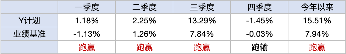Y计划全年维持股债均衡配置,股票仓位中性偏高。全年来看,组合实现了15.51%的年度收益,大幅跑赢业绩基准,超额达到7.57%。