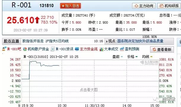 我找到2013年2月7日的一个截图,早上最高收益到过34%哦~ http://quote.eastmoney.com/sz131810.html 这里可以看参考价格。