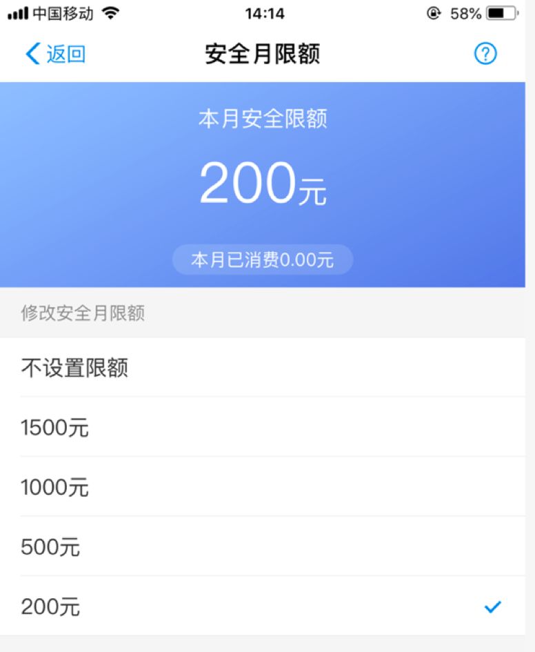 5、如果需要使用这个功能,但又怕被盗刷,可以主动“止损”,即点击上图中的【安全月限额】,设置每月限额为最低的每月200元,即使遭遇盗刷也能减少损失。