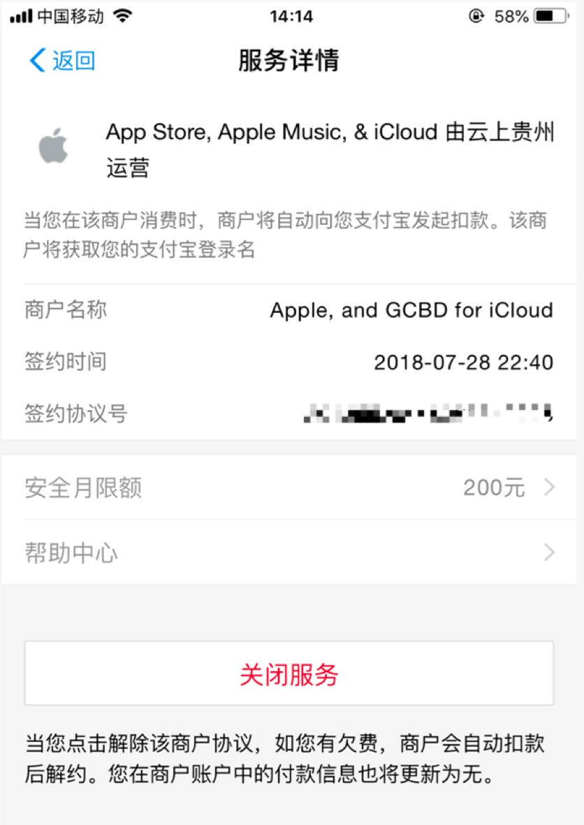 进入支付宝APP,点击【我的】-【设置】-【支付设置】-【免密支付/自动扣款】-【APP Store,Apple Music&iCloud】-【安全月限额】设定符合自己安全预期的月度限额。