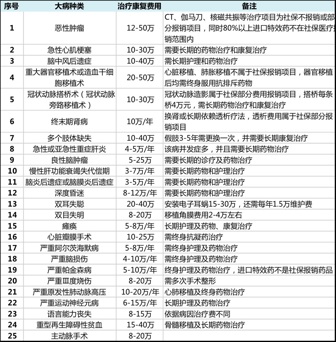 重疾治疗是很费钱的,规划君找了一张原保监会(现在叫银保监会)公布的25种重大疾病治疗康复费用一览表↓(点击可看大图)